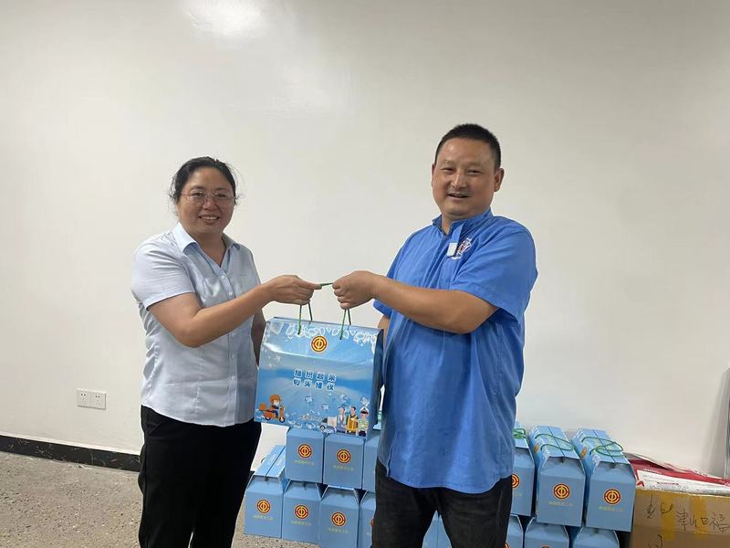 盛夏送清凉 用心传关爱发表时间:2023-07-03 14:50 今年7月份以来,气温持续升高,酷暑“烤”验着每位坚守在生产一线的职工。为切实做好2023年的防暑降温和“夏送清凉”工作,确保职工平安度夏,津山口福工会在6月底制定了防暑降温方案,开展了一系列夏日送清凉活动,把关爱和清凉送给了坚守岗位的一线职工。 01 活动现场,津山口福工会主席左立英为职工送上“桃源县总工会清凉大礼包”,内含各类防暑降温用品。同时,送上“娘家人”的问候,叮嘱他们注意身体健康,注重劳逸结合,确保夏季工作的安全、健康。“感谢工会对我们的关心和关爱,让我们更有干劲了!”一位高温作业职工代表开心地说道。