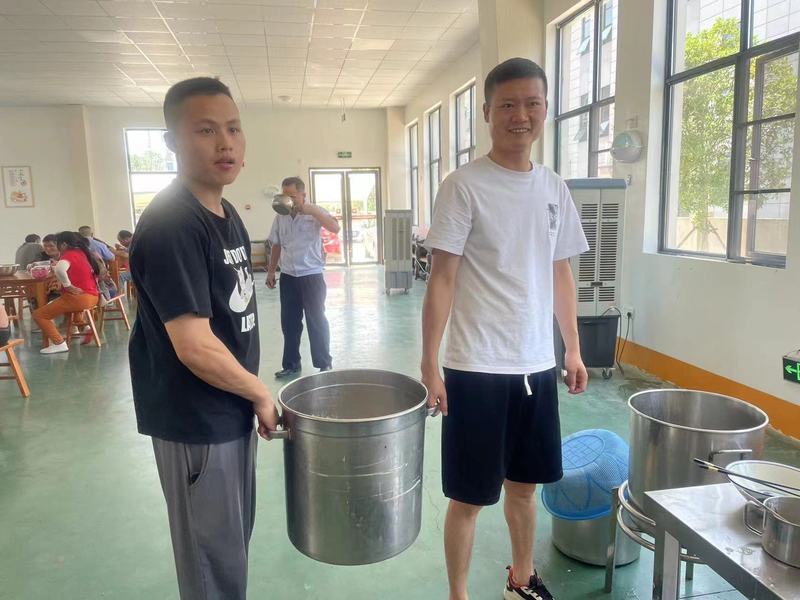 发放爱心西瓜 03 为了让职工以饱满的精神状态投入到工作中,食堂膳食委员会定期调整食谱,增加清淡去燥热的菜品,提供清爽可口的凉拌菜、开胃菜和降温解火的绿豆粥,来增进职工的食欲。食堂每天早上熬制绿豆汤,由”清凉小分队”派发到车间,供职工饮用,切实做好后勤保障工作,把工会组织的关怀和温暖送到职工心坎上。